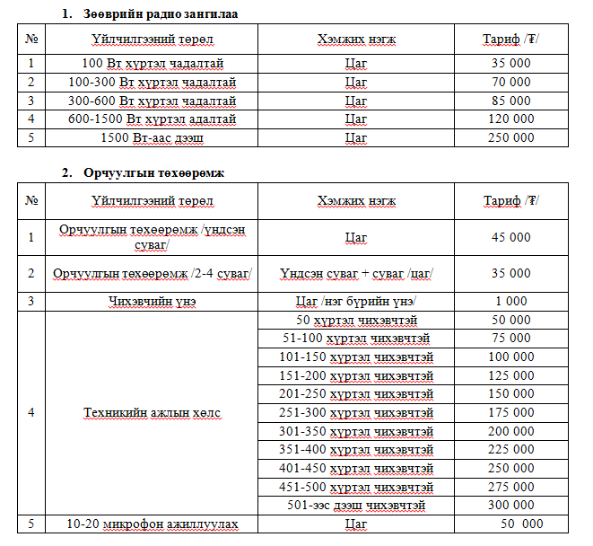 Тайлбар: Хотын төвөөс 30 км-ээс дээш зайд зөөврийн радио зангилаа, орчуулгын төхөөрөмжийг захиалгаар ажиллуулах тохиолдолд төхөөрөмж тээвэрлэх тээврийн зардал, инженер техникийн ажилтан нарын байр, хоолны зардлыг захиалагч байгууллага хариуцна.