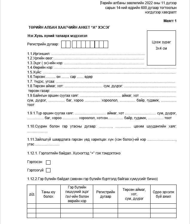 Та манай байгууллагад ажлын зарын дагуу ажилд орох хүсэлтэй бол доорх анкетийг татаж бөглөөд мэйл хаягаар илгээнэ үү.
